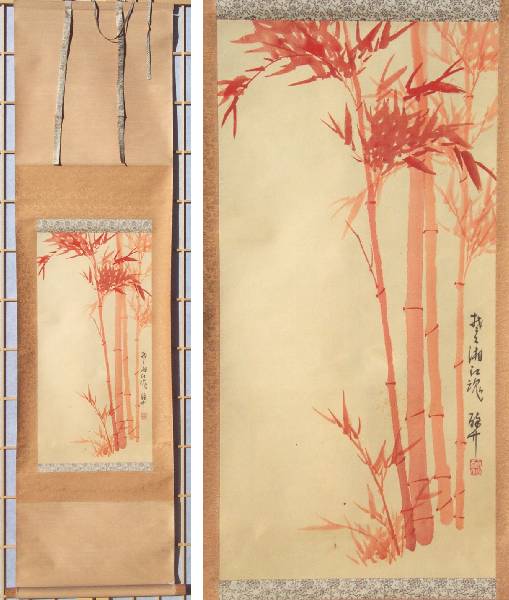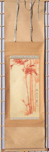 An attractively painted clump of bamboo done in reddish-orange--nicely mounted as a mid-length hanging scroll. A unique, true one-of-a-kind artwork. |