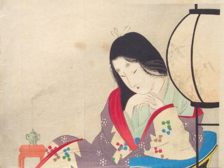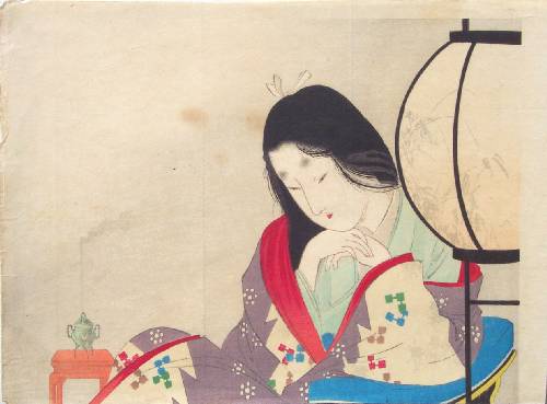 Very Fine. Superbly executed "bokashi" shading to lampshade and "wisp" of smoke; "burnishing" to black lamp and as "overlaid" hair; crisply detailed lines. |
