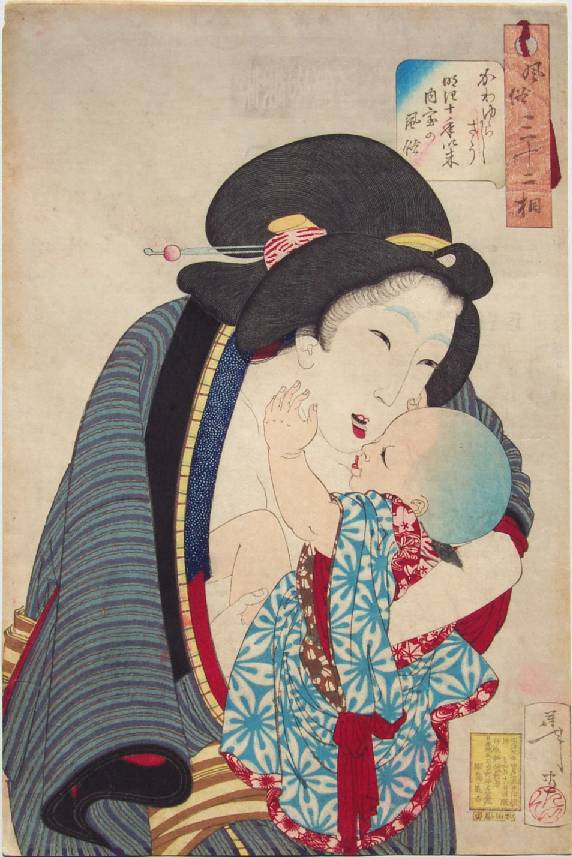 A darling image--this housewife's expression gushing with maternial love for her baby--among the finest images of the "Fuzoku" series. |