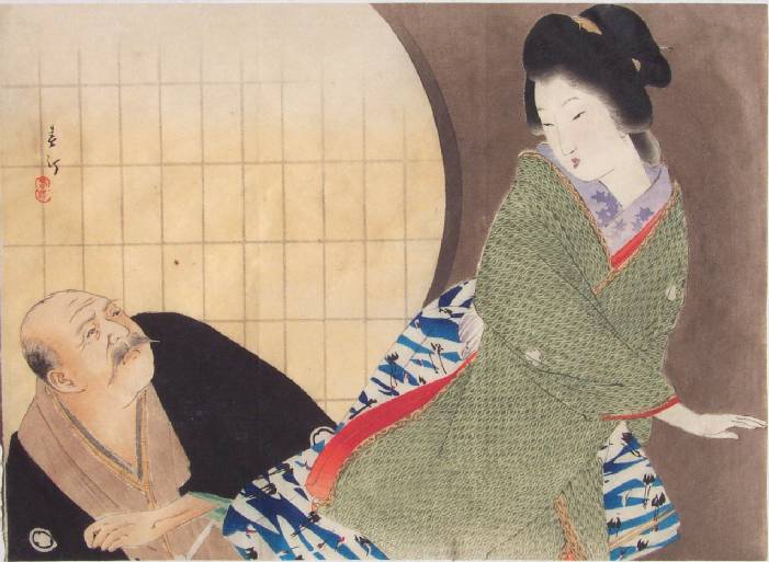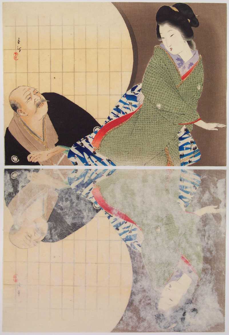 A wonderfully printed image--this teahouse waitress appears to repel that advances of an older customer before a decorative, round shoji window. |