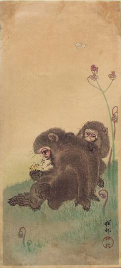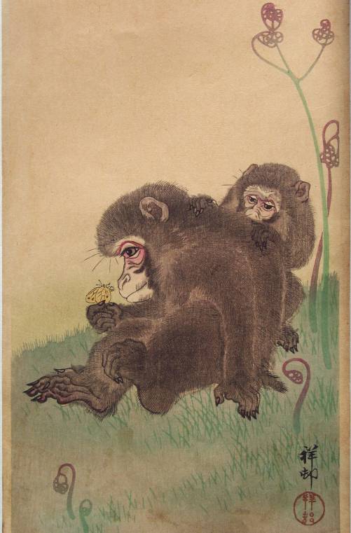 An absolutely charming image of two curious monkeys, one holdling a captured butterfly. |