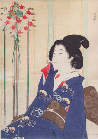 A young bijin is seen sitting contemplatively beneath a bouquet of flowers. |