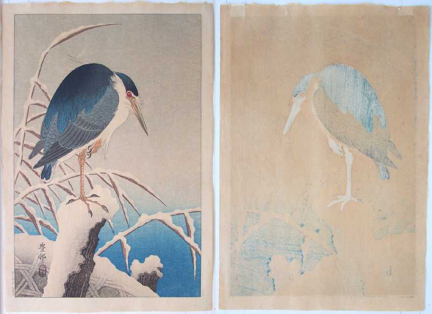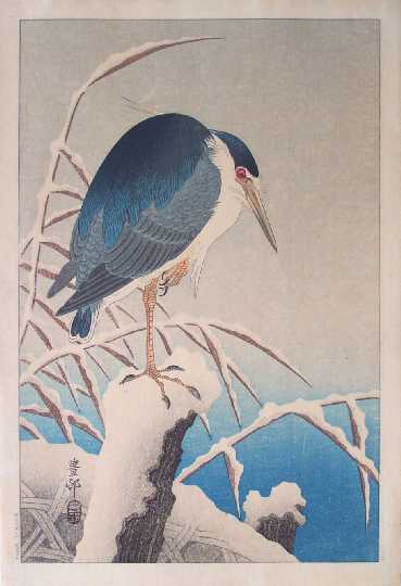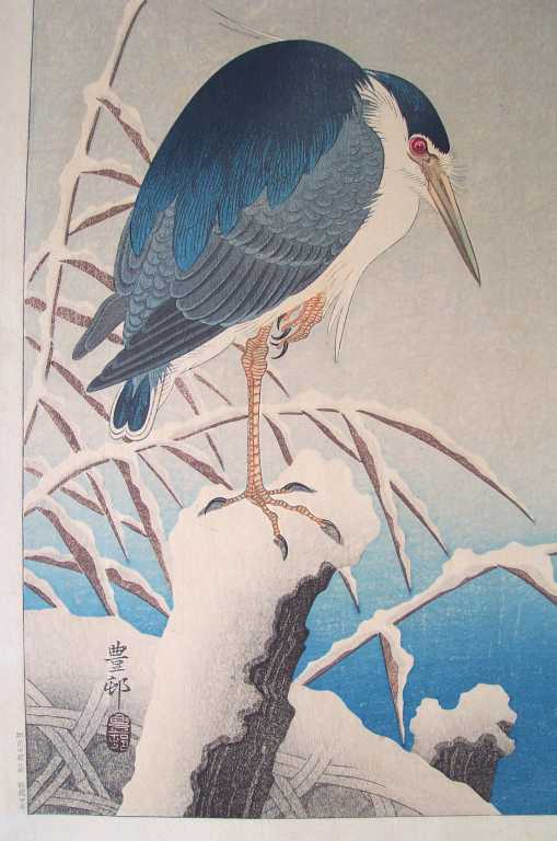 Very Fine. Superbly executed soft "bokashi" shading to heron, snow-covered areas, and background; light