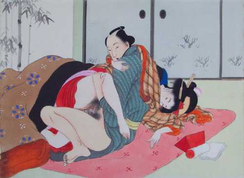 "shunga" designs. From an album of 12 original paintings on silk which preceeded the publication of a 12 woodblock