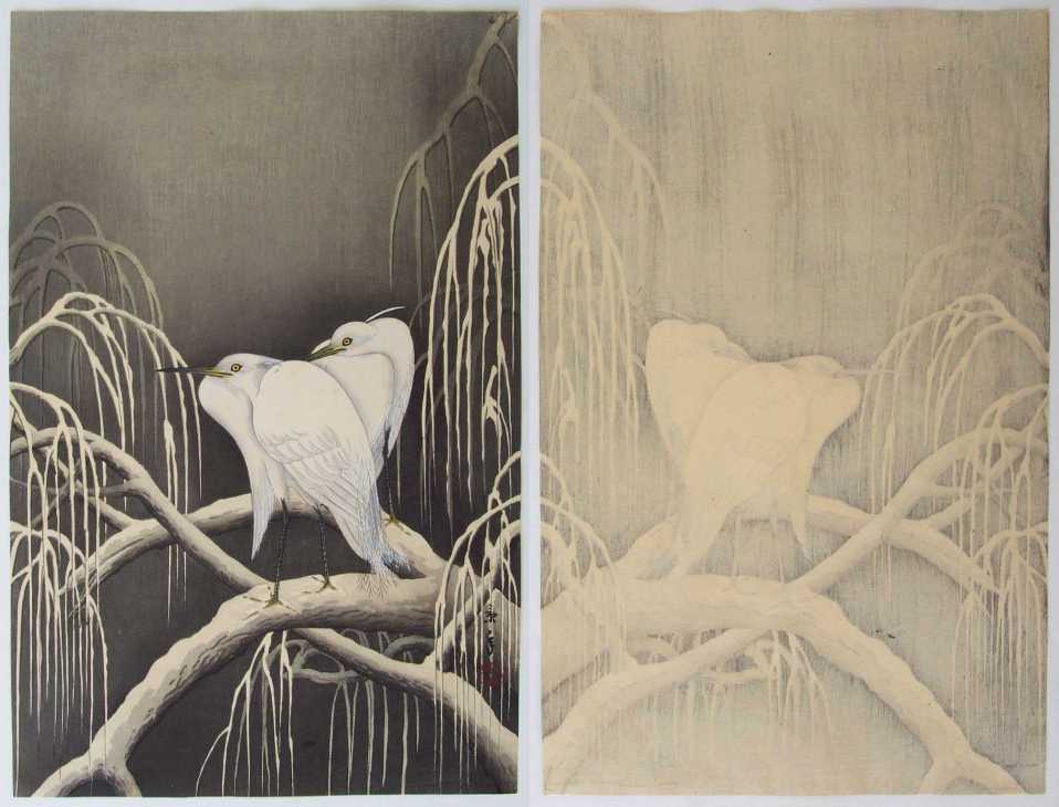 A striking wintertime image. Reminiscent of Koson's earier works and arguably Keinen's technically finest print. Pre-War image.