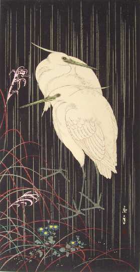 Very Fine. Soft "bokashi" shading to bird's feathers; extensive "gauffrage" as falling rain streaks, and
