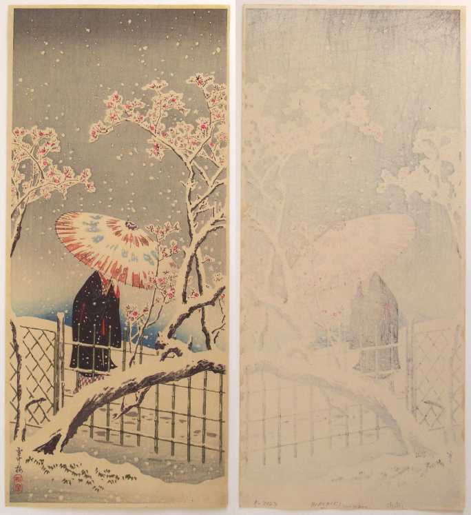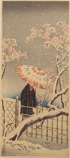 Very Fine. Superbly executed "bokashi" shading; "gauffrage" to falling "snowflakes," "snow accumulation,"