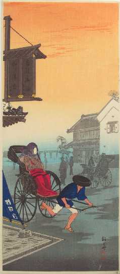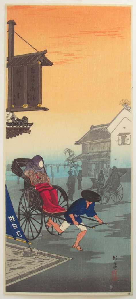 Very Fine. Superbly executed "bokashi" shading; light "gauffrage" to signboard; crisply and highly detailed carving. |
