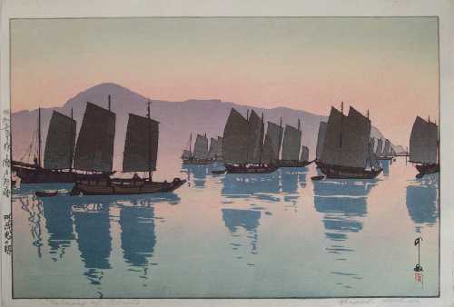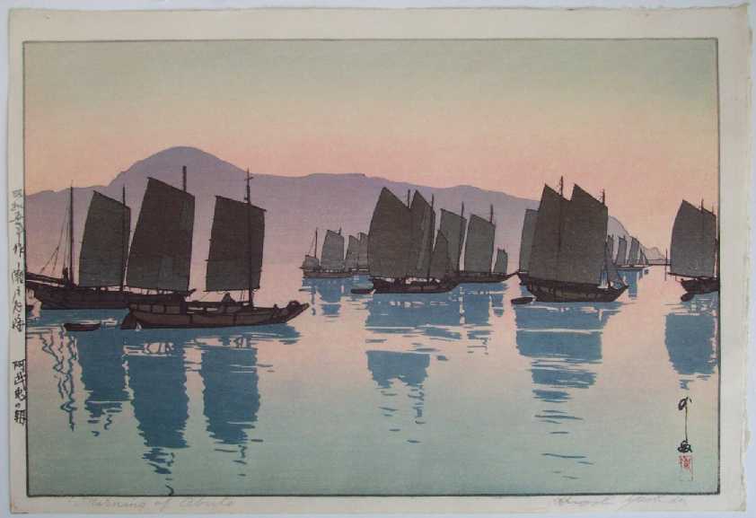 Wonderfully colorful sailboat image. One of 12 prints from Hiroshi's two-month "sketching trip" of March
