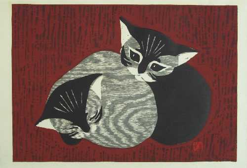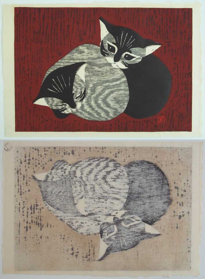 Very Fine. Bold, fresh colors; on heavy, handmade paper. Nicely visible woodgrain pattern to grey cat.
