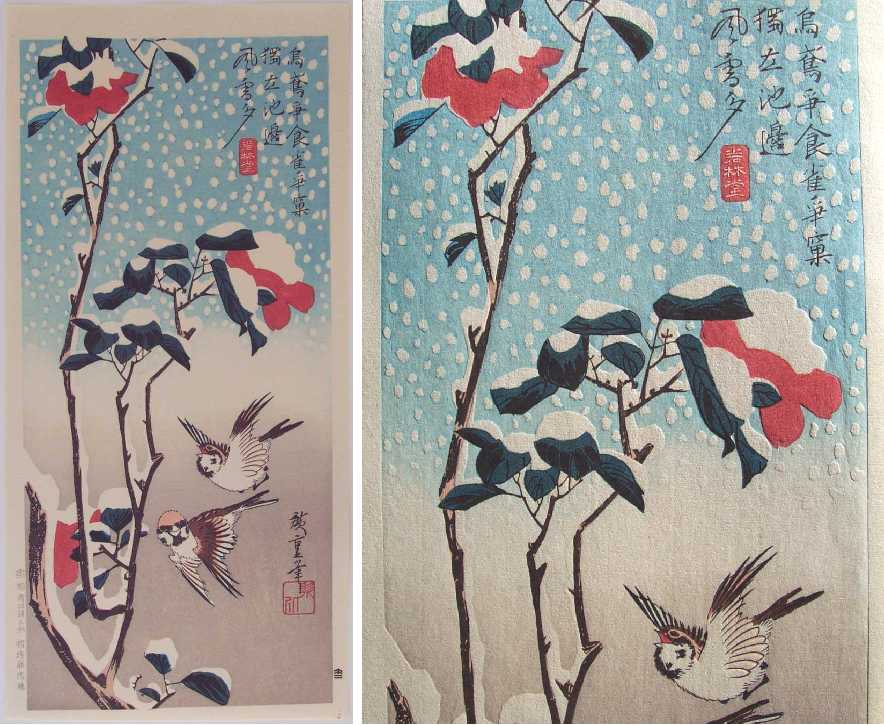 Very Fine. Nicely done "bokashi" shading; "gauffrage" to falling snow flakes; highly