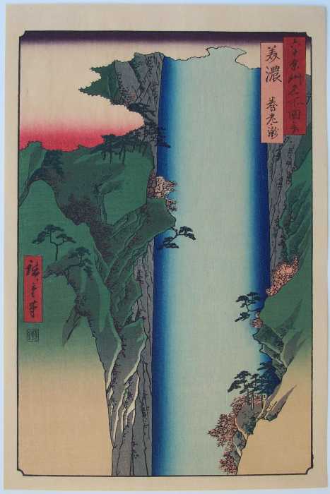 Very Fine. Skillfully executed "bokashi" shading; "gauffrage" to clouds, and waterfall; nicely visible