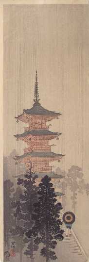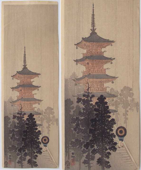 Very Fine. Superb "bokashi" shading to trees, pagoda, and foreground; light "gauffrage" to falling rain; extremely fine detailing. |