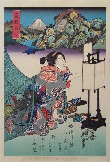 An elegant scene from the series "Beauties along the Tokaido" which featured beauties and courtesans traveling