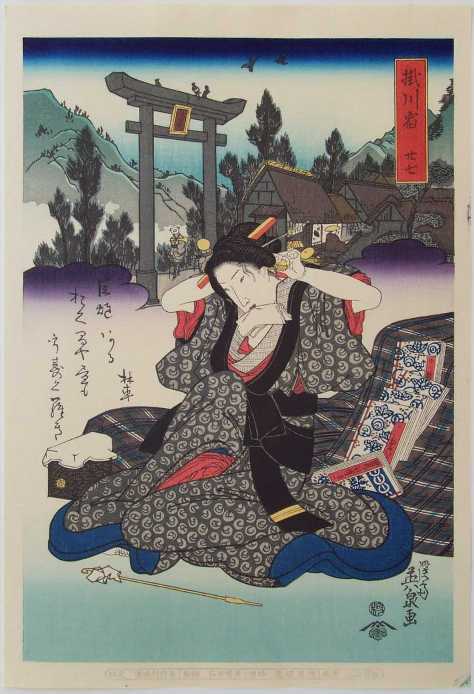 An elegant scene from the series "Beauties along the Tokaido" which featured beauties and courtesans traveling