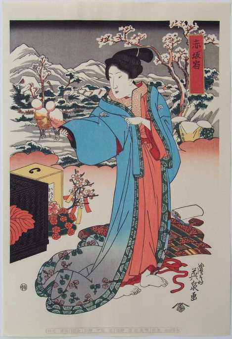 An elegant scene from the series "Beauties along the Tokaido" which featured beauties and courtesans traveling