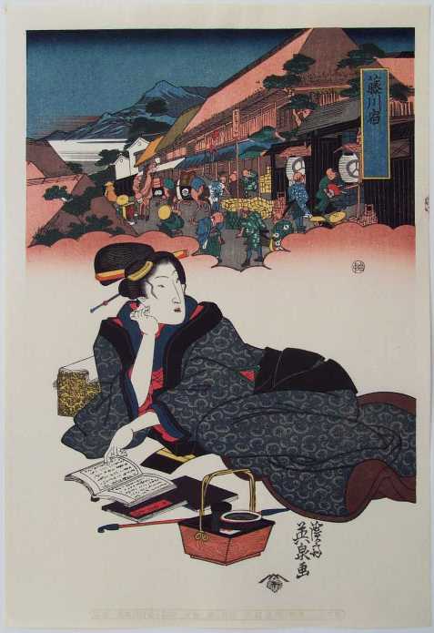 An elegant scene from the series "Beauties along the Tokaido" which featured beauties and courtesans traveling