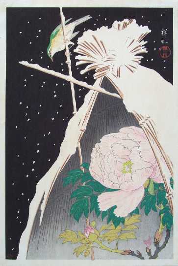 Very Fine. Nicely executed "bokashi" shading to straw background; lightly "gauffraged" snow accumulation;