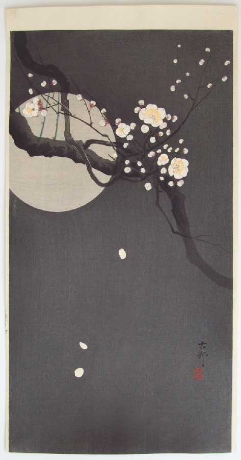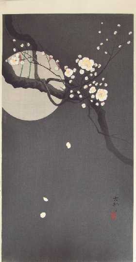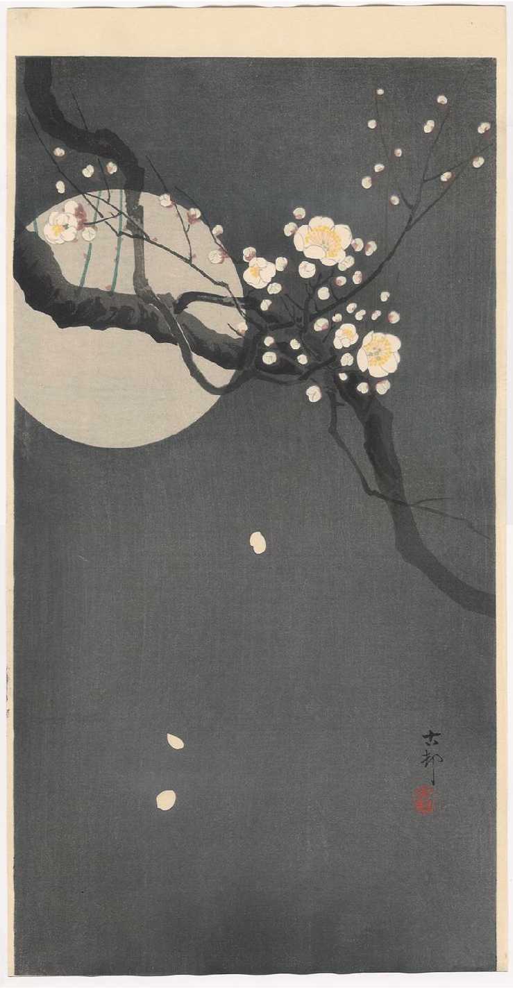 An evocative nighttime image of a flowering plum branch set against a full moon, with a few petals floating