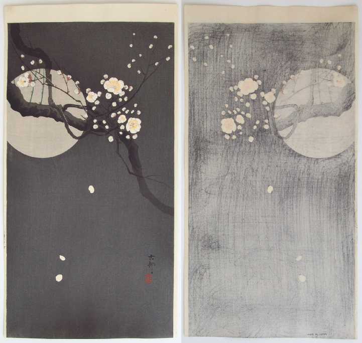 Very Fine. Nicely executed "bokashi" shading to grey background; slightly visible woodgrain; sharp key-lines,