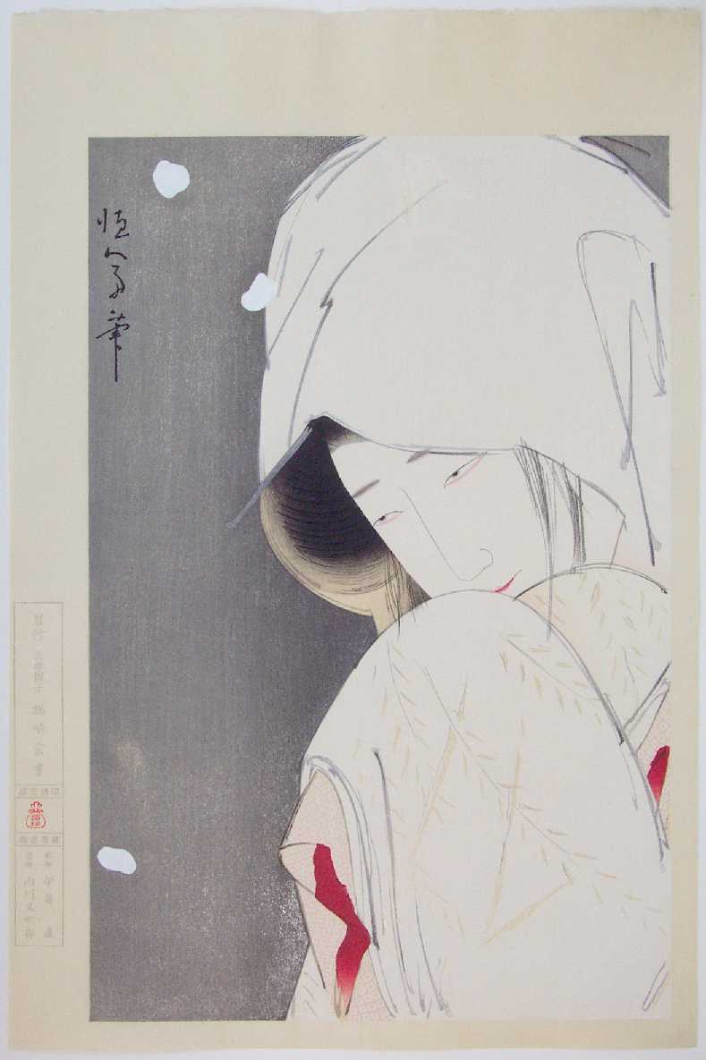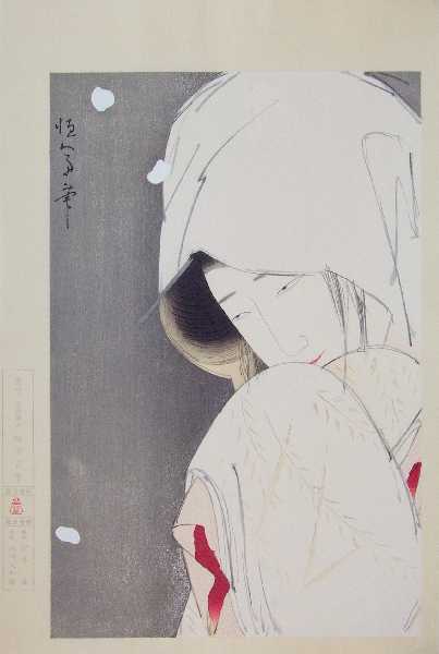 background; "gofun" applied as snowflakes (some minor/normal bleeding surrounding);