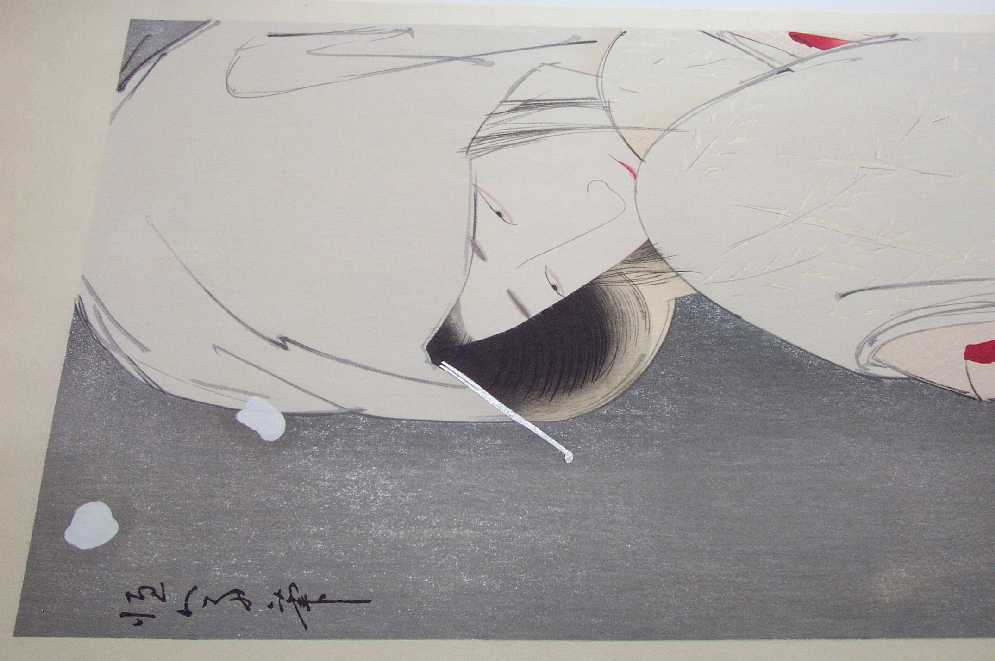 silver "mica" to entire background; silver "metallic" highlights to hair-pin and lower kimono;