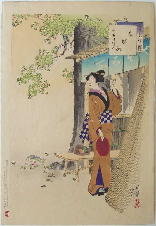 Colorful and skillfully printed "bijin-ga" image of teahouse maid under a ginko tree. |
