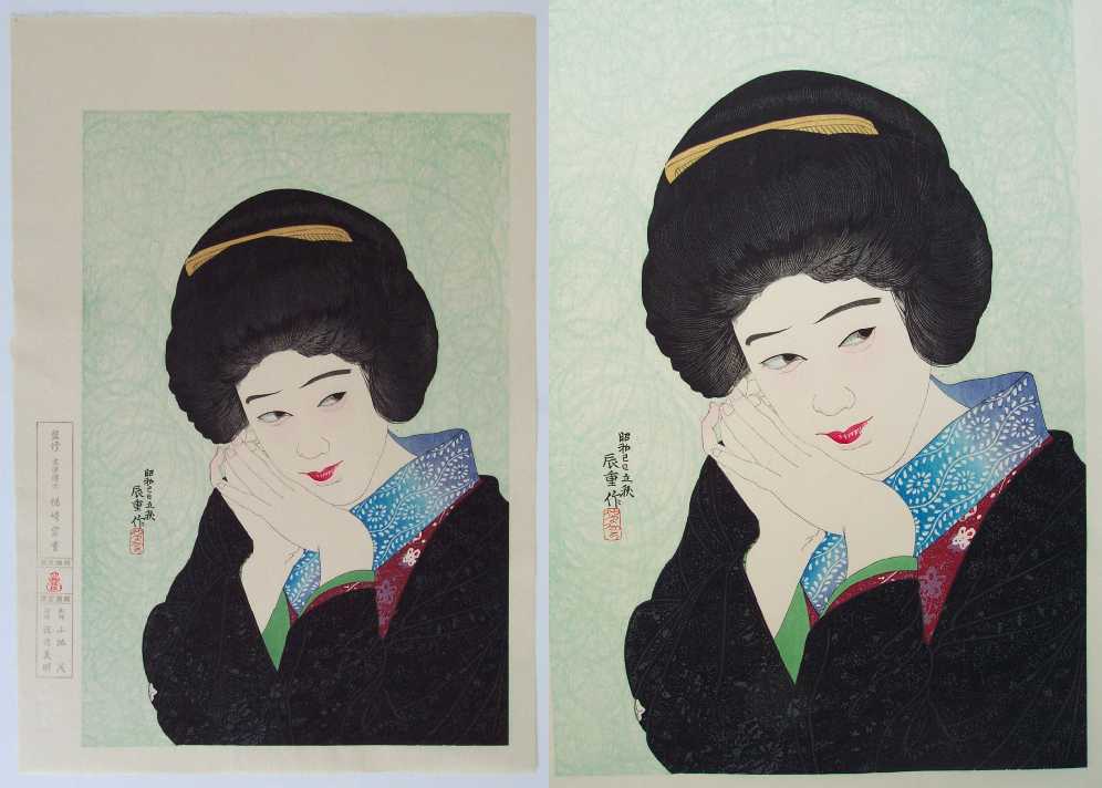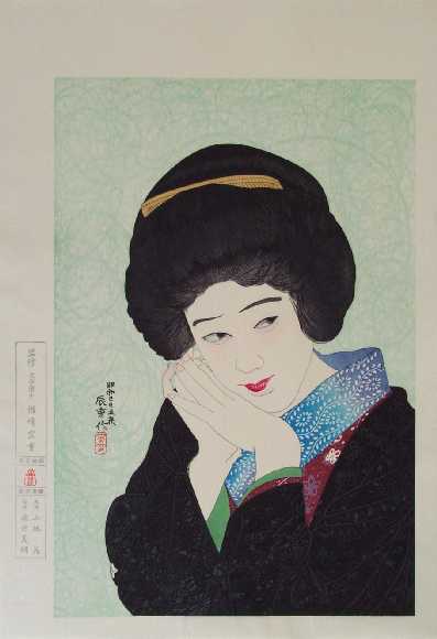 One of the very few "bijin-ga" images of this seldom encountered artist, a student of Yoshitoshi. "Re-strike" edition published as a small,