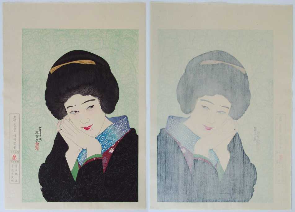 Very Fine. Skillfully executed "bokashi" (gradation of colors) shading to face, hands, and collar; light