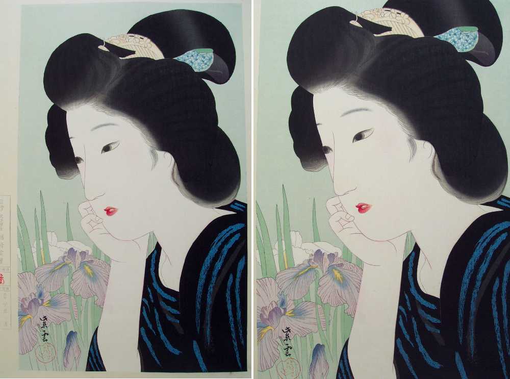 Very Fine. Skillfully executed "bokashi" (gradation of colors) shading to face, hair, and irises; light