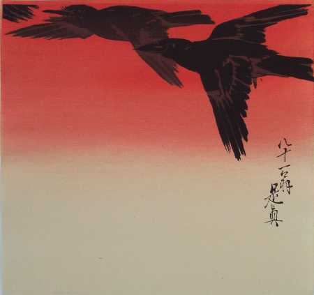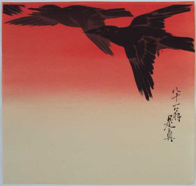 Zeshin's classic image of three flying crows, set against a brilliant orange-colored sky. PRE-1923