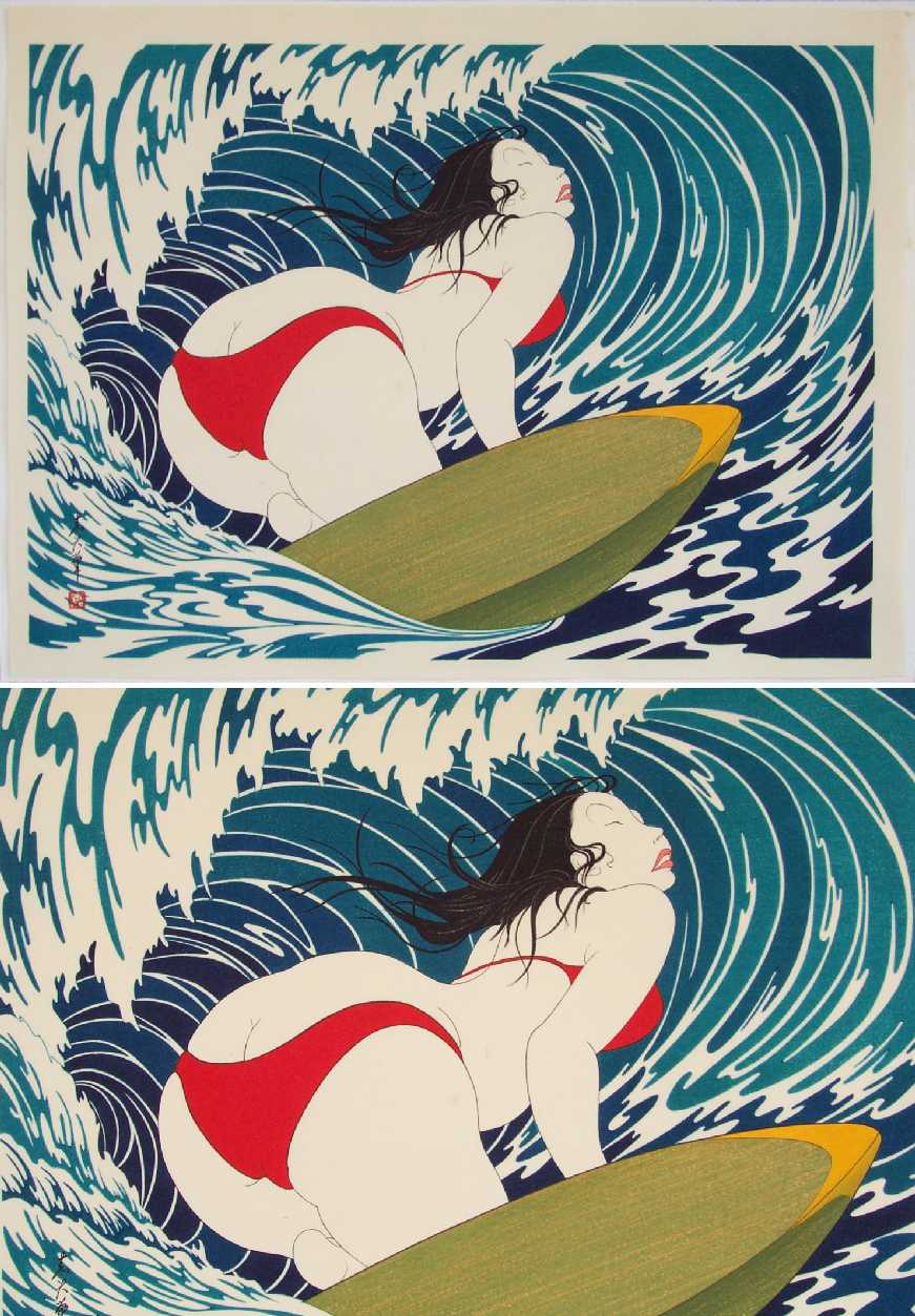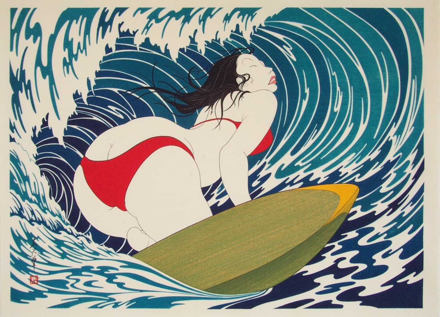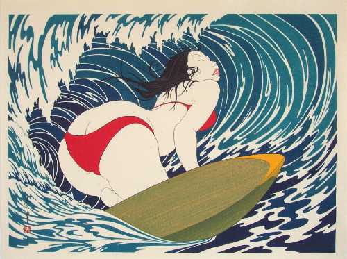 A strikingly voluptuous modern-day "bijin-ga" image--surfing eyes closed under a curling wave.