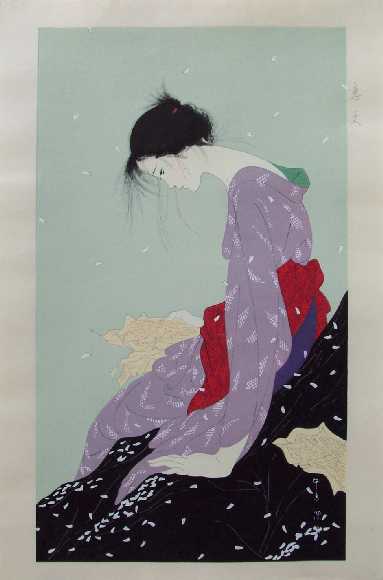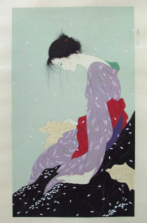 A young beauty reads a love letter under a shower of falling flower blossoms. Nakajima's