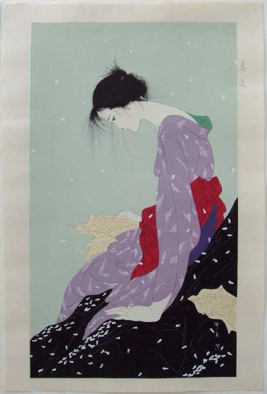 From a small series of "bijin-ga" images of a pensive young woman seen outdoors. |