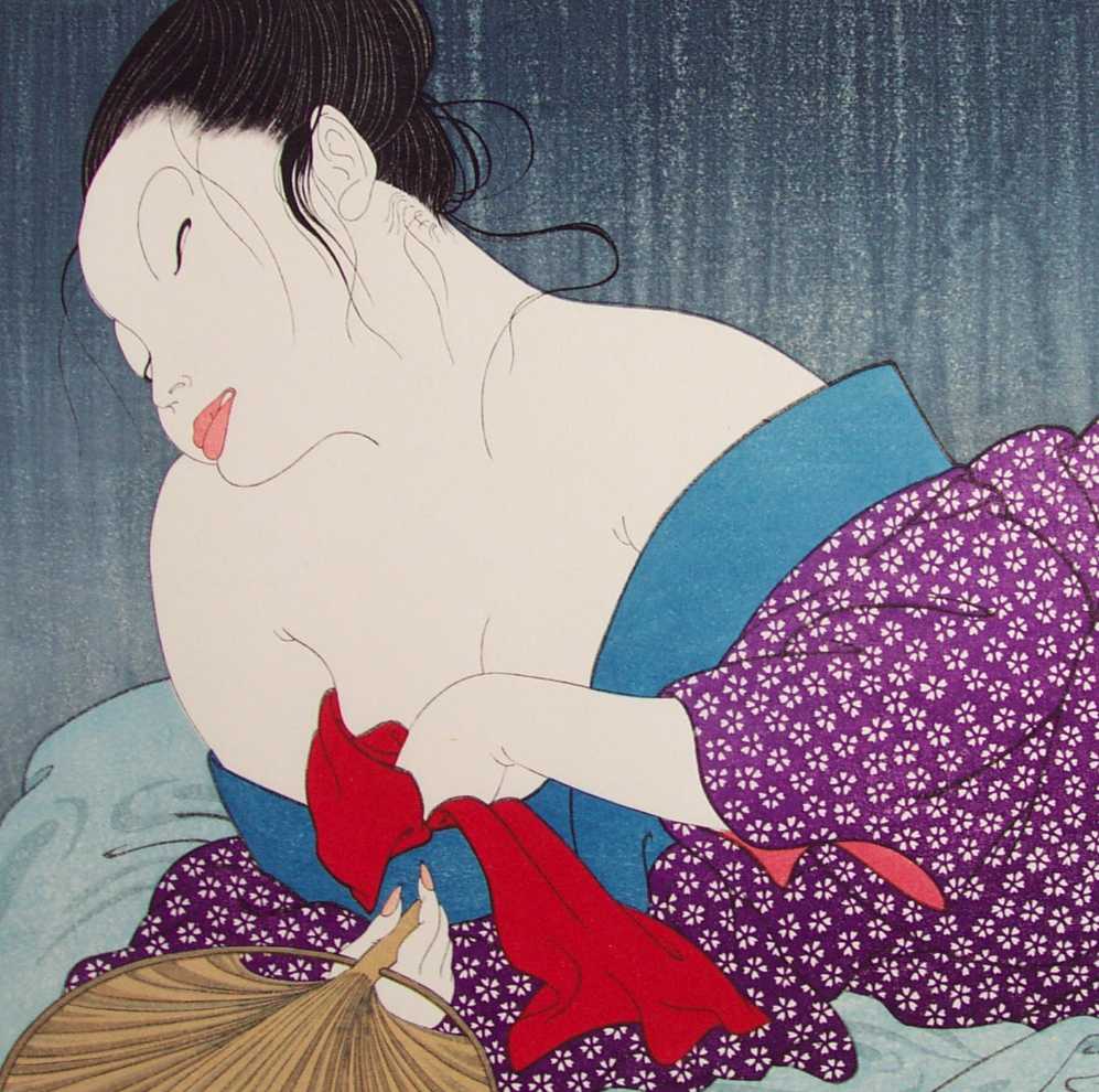 A strikingly sentuous modern-day "bijin-ga" image--eyes closed, bared shoulders.