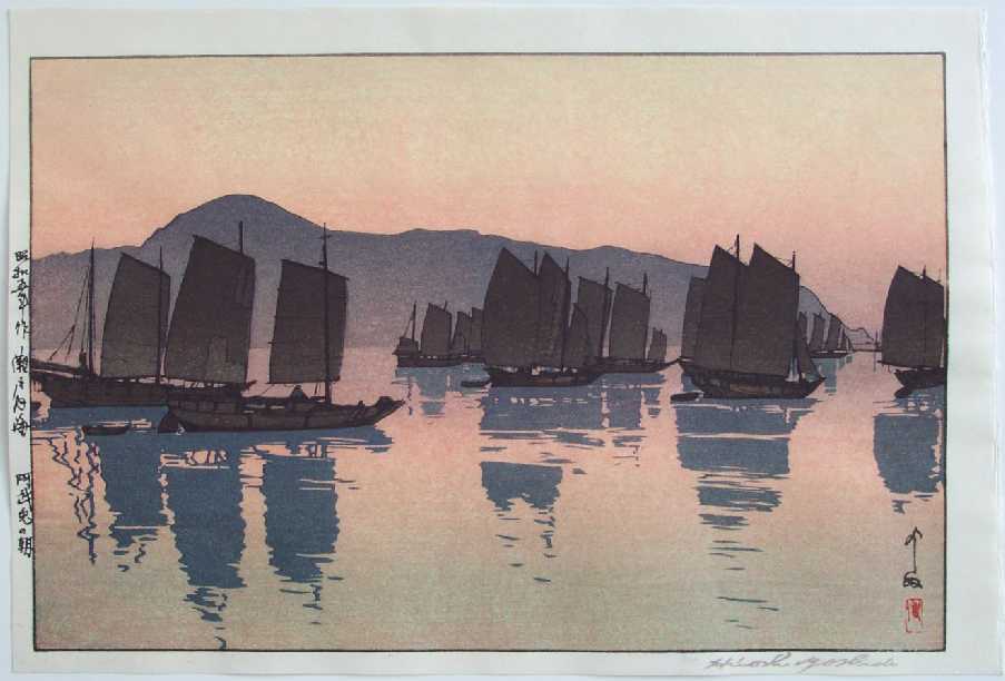 Wonderfully colorful sailboat image. One of 12 prints from Hiroshi's two-month "sketching trip" of March