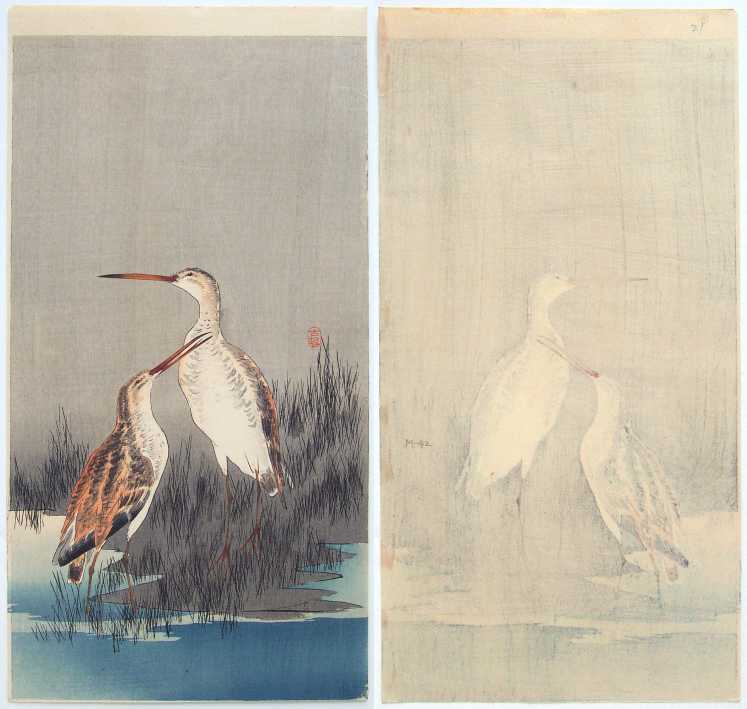 Very Fine. Soft "bokashi" shading; deep "gauffrage" to outline of birds and feathers;