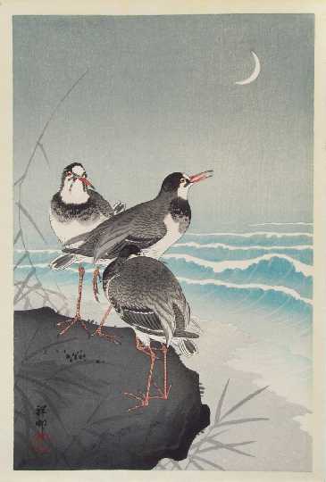 A beautiful "kacho-e" seascape with three highly detailed plovers under a crescent moon. |