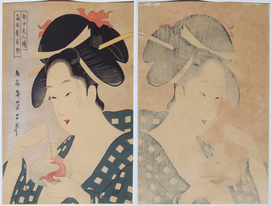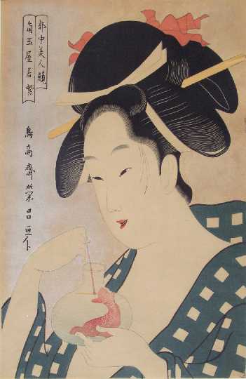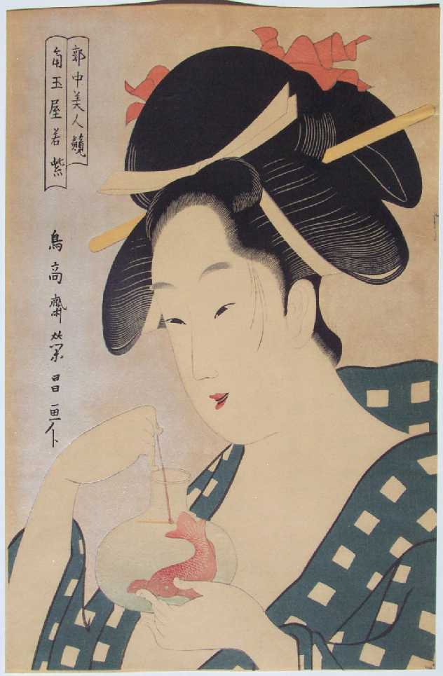 Delightful image of a bijin fascinated by her pet goldfish. Faithfully re-printed using colors to