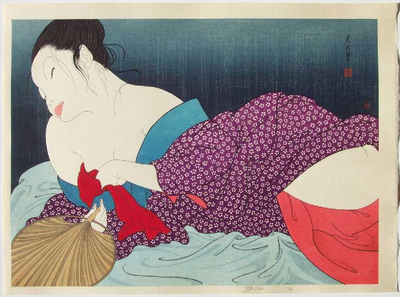 A strikingly sentuous modern-day "bijin-ga" image--eyes closed, bared shoulders.