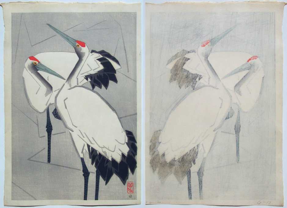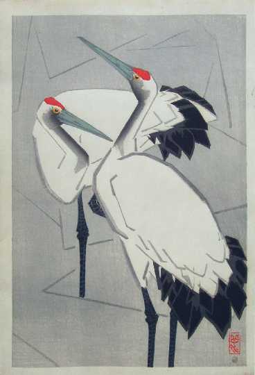 Very Fine. Nice "bokashi" shading; light "gauffrage" (embossing) to outline of herons; "burnishing" to black