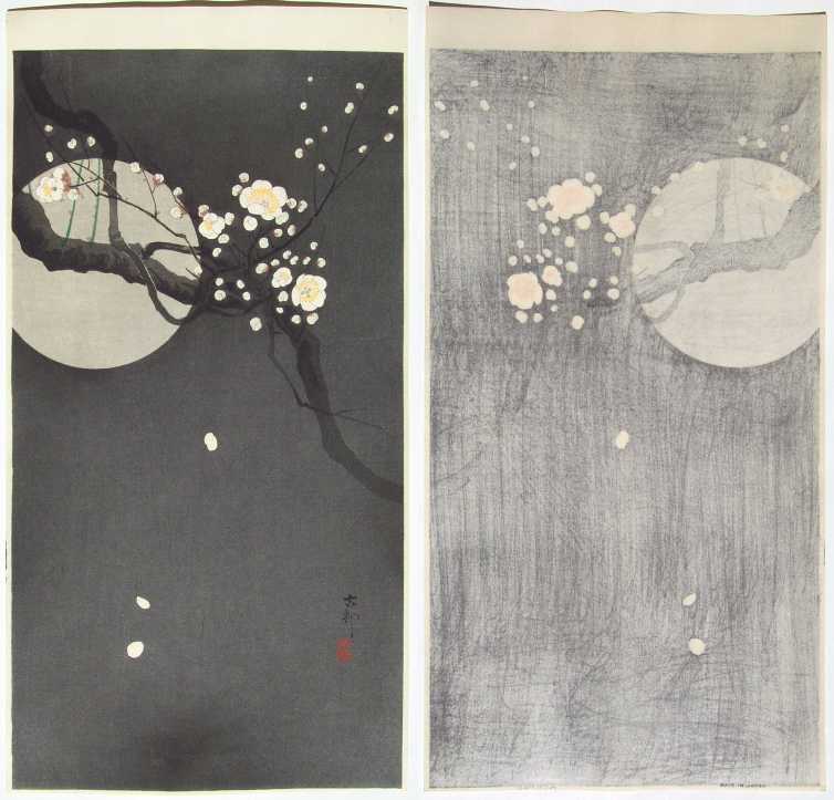 Very Fine. Nicely executed "bokashi" shading to grey background; slightly visible woodgrain; sharp key-lines,