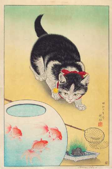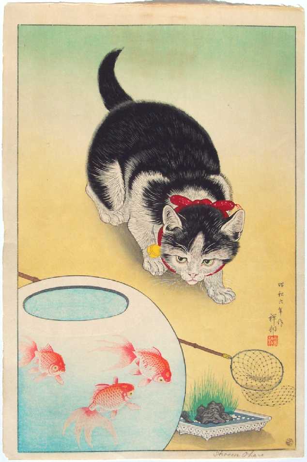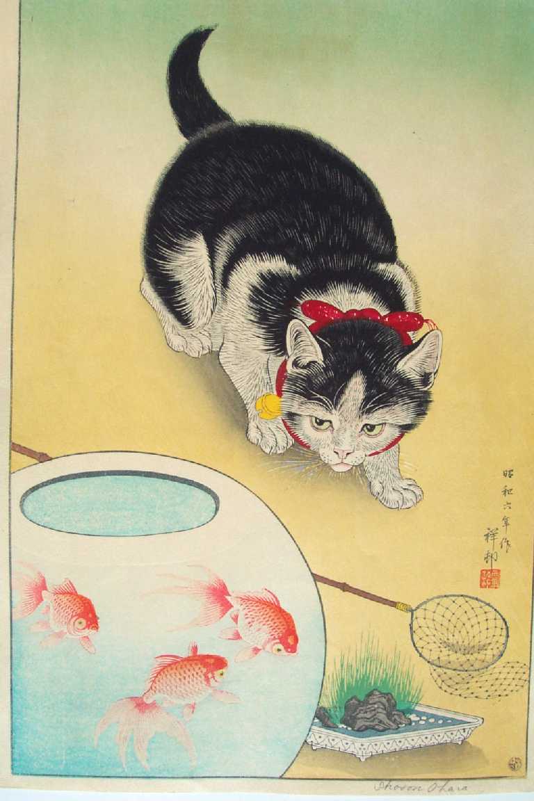 Delightful image of a cat stalking three goldfish hiding in a bowl. Very rarely seen. (Image seen in "CCC"