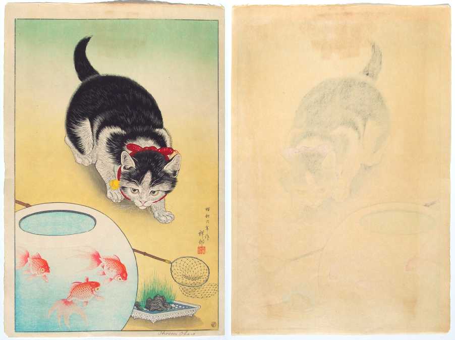 Very Fine. Skillfully executed "bokashi" shading; extensive "gauffrage" to cat's fur and body;