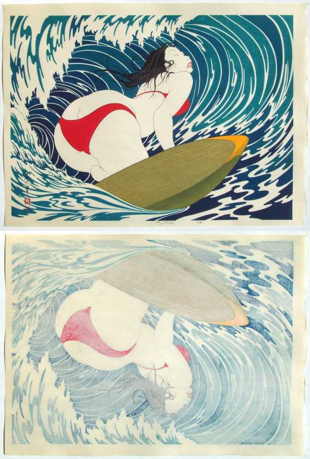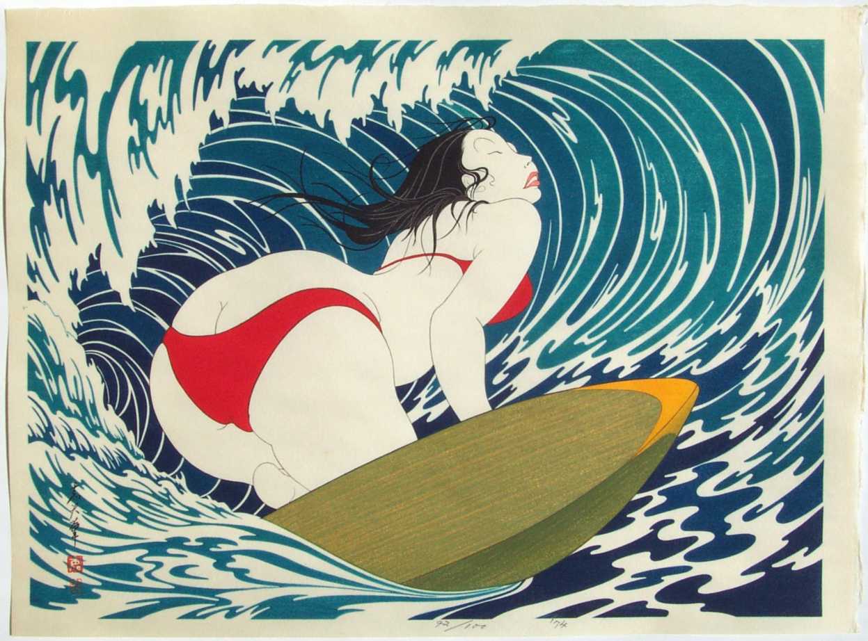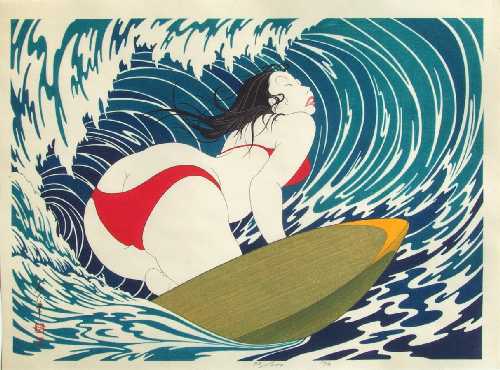 A strikingly voluptuous modern-day "bijin-ga" image--surfing eyes closed under a curling wave.
