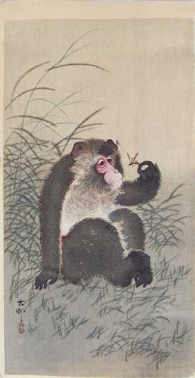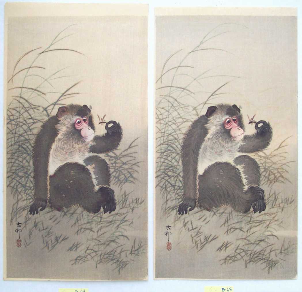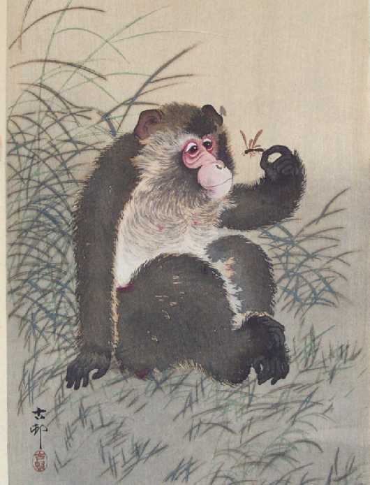A delightful Koson image of a monkey holding and inquisitively studying a dragonfly. PRE-1923 earthquake (note: Daikoku-ya Publisher ceased
