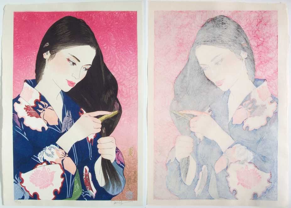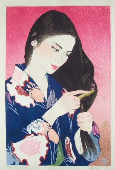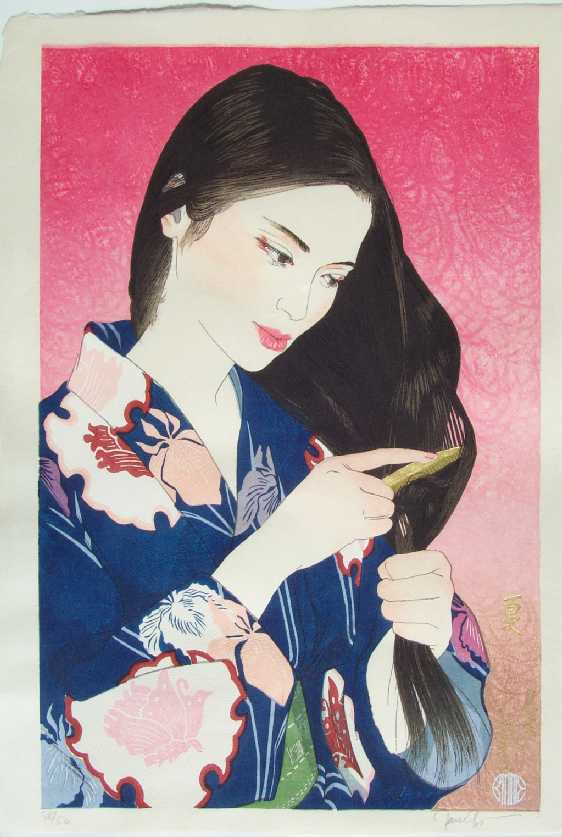 Very Fine. Skillfully executed "bokashi" (gradation of colors) shading; "burnished" highlights to black hair;