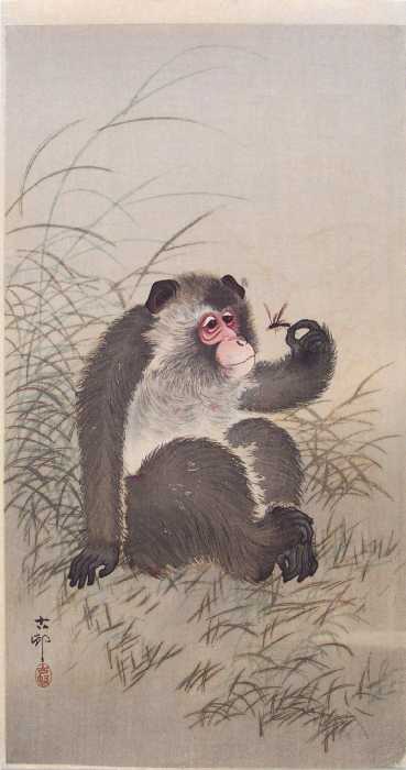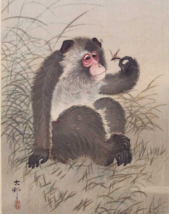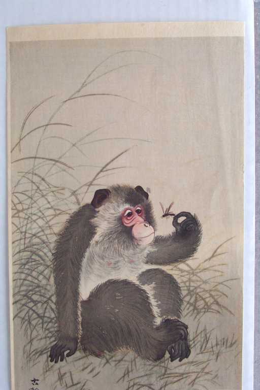 A delightful Koson image of a monkey holding and inquisitively studying a dragonfly. PRE-1923 earthquake (note: Daikoku-ya Publisher ceased