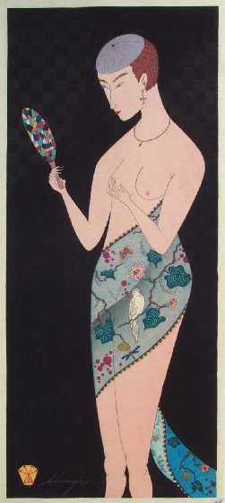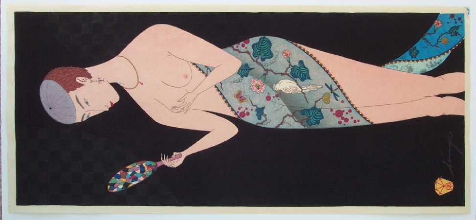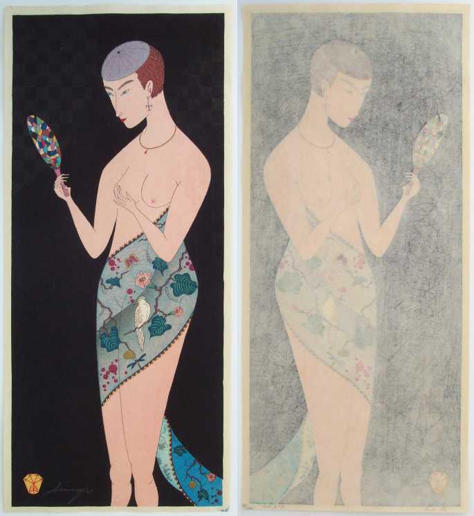 Very Fine. Nicely done "bokashi" (shading) to transparent garment; upper background has