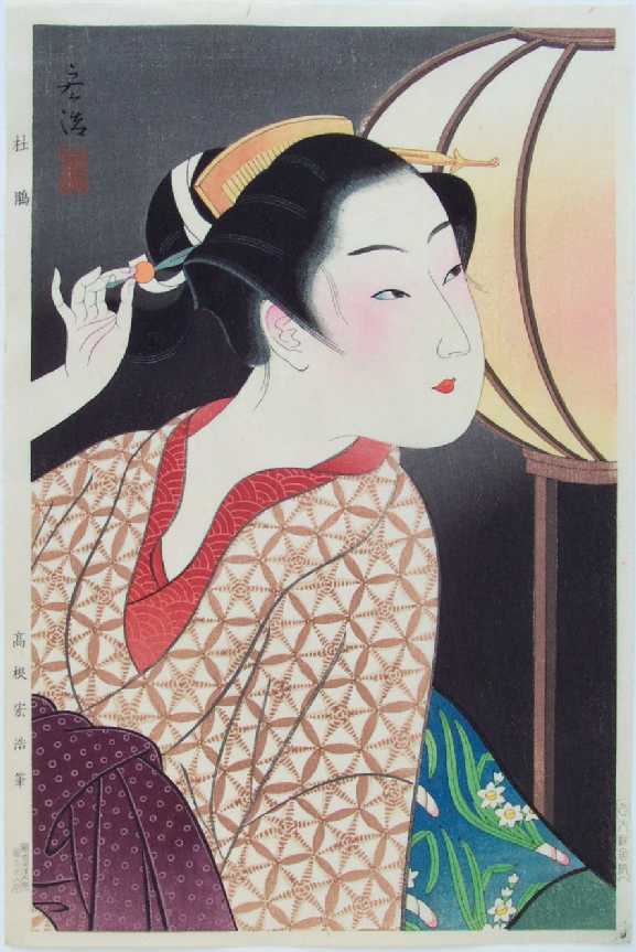 lantern ("andon") as she listens intently to the distant call of a cuckoo. A rarely see print. |